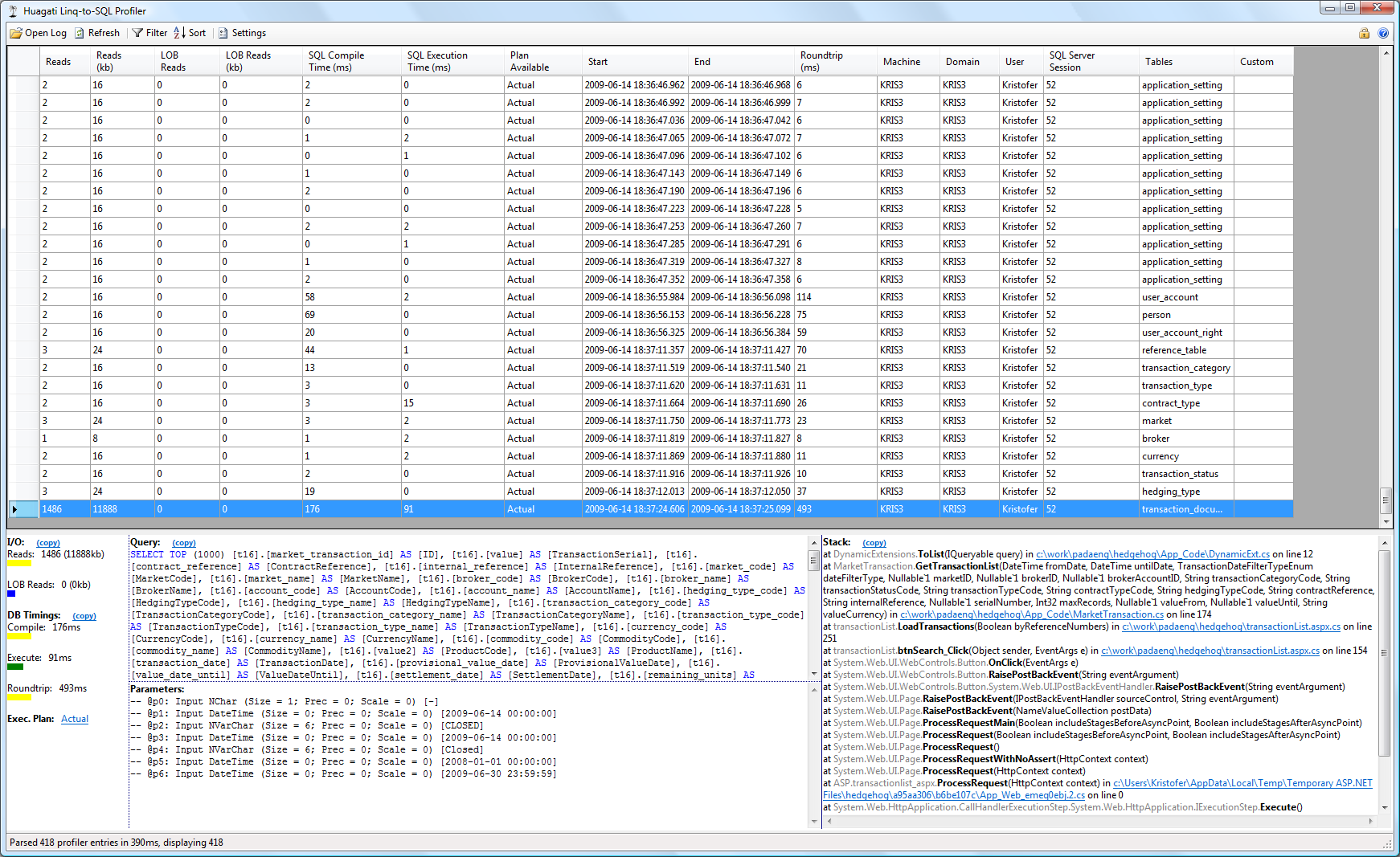 Huagati Query Profiler is a toolkit that enable runtime profiling of Linq-to-SQL, Entity Framework v4, and LLBLGen Pro 2.6 based software accessing Microsoft SQL Server databases. It consists of the Huagati Linq-to-SQL Profiler, Huagati EF Profiler, and Huagati LLBLGen Profiler runtime components, and a profiler log explorer application.